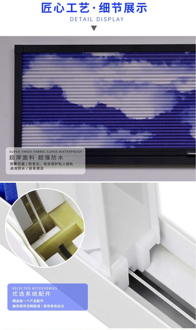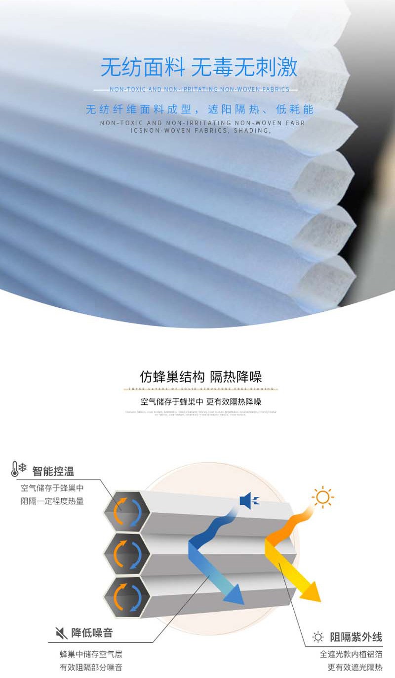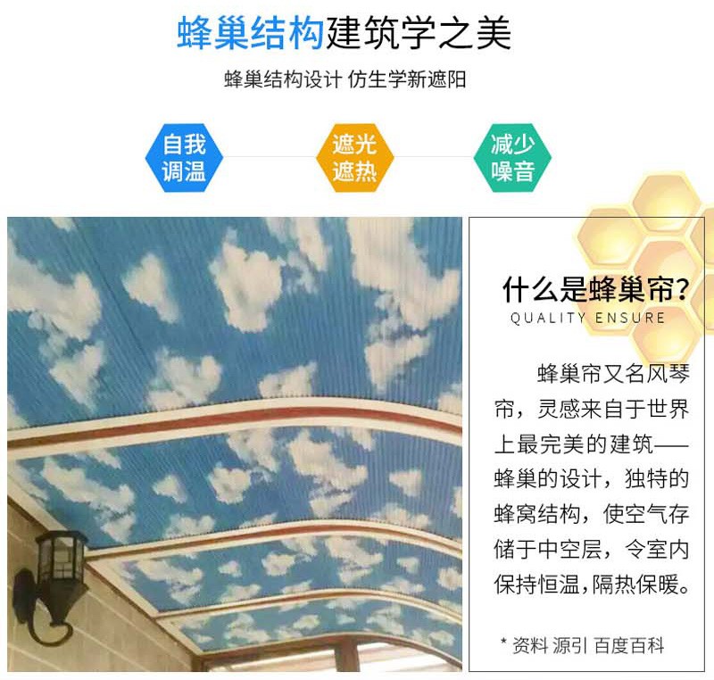 蜂巢簾又名風(fēng)琴簾,靈感來源與世界上最完美的建筑--蜂巢的設(shè)計(jì),獨(dú)特的蜂窩結(jié)構(gòu),使空氣存儲(chǔ)于中空層,令室內(nèi)保持恒溫,隔熱保暖。