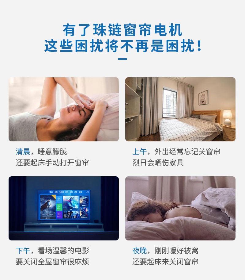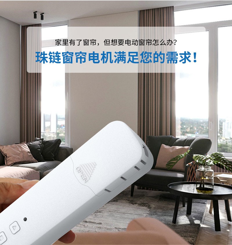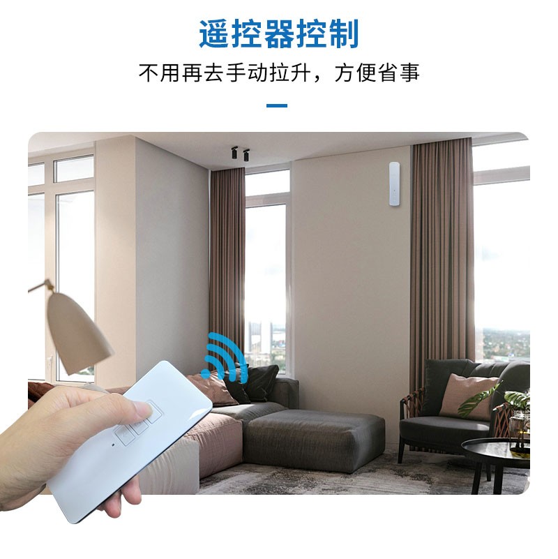 此產(chǎn)品適用于拉珠卷簾,可以把傳統(tǒng)的拉珠卷簾改變?yōu)橹悄茈妱?dòng)窗簾,安裝簡單,操作方便。安裝后可通過遙控器、語音、手機(jī)APP等控制窗簾升降。